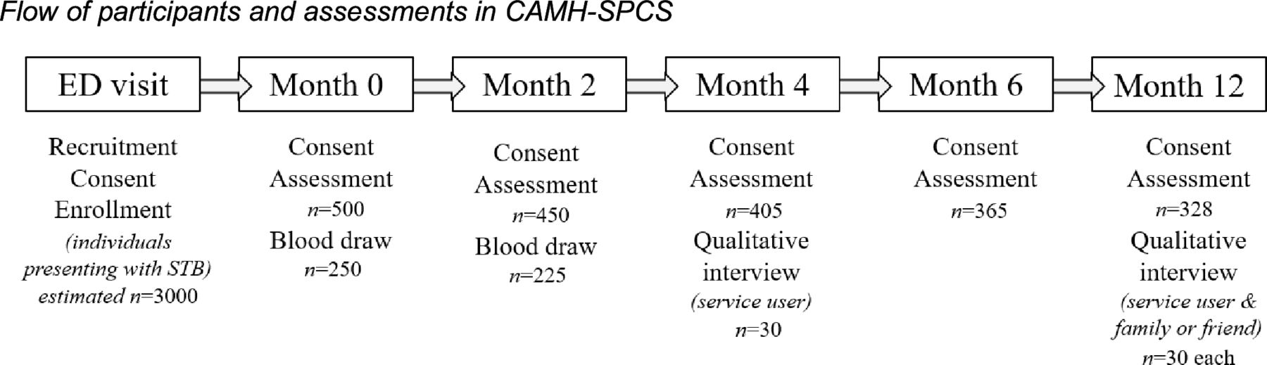 “Introduction: Identifying individuals at risk of suicide remains an ongoing challenge. Previous research investigating risk factors for suicidal thoughts and behaviours (STB) has been informative for assessing suicide risk. However, the complex biological, psychological and sociocultural factors underlying STB have not been comprehensively captured to date, which has limited our understanding of how these factors interact to influence STB. Moreover, acute care settings, such as emergency departments (EDs), are often first points of contact for individuals with STB, highlighting a need for more research in these settings. Methods and analysis: We aim to (1) characterize a cohort seeking care for STB and their clinical trajectories; (2) situate the cohort by comparing its characteristics and outcomes to other groups seeking emergency care; (3) explore their experiences of seeking care; and (4) examine blood-based biomarkers modulating risk for STB. Using a multimethod, prospective cohort design, we will follow up to 500 people aged 16 or older presenting to the ED with STB at a psychiatric hospital over 1 year. Analyses will involve descriptive statistics and latent profile analysis to characterize the cohort, hypothesis tests and regression models to situate the cohort, qualitative analysis based on a realist research framework to understand experiences, and within-participant comparisons of proteins, mRNA and epigenetic DNA modifications to examine biomarkers of contrasting states of STB. Ethics and dissemination: This study was approved by the hospital’s Research Ethics Board with safeguards in place to ensure the well-being of participants and research team. An integrated knowledge translation approach will be used for dissemination, wherein patient and family advisors are engaged throughout each study phase. Findings will enhance our understanding of the multifactorial nature of suicide risk, inform strategies for prevention and provide important insights into characteristics, experiences and outcomes of individuals with STB, who are under-represented in mental health research.”