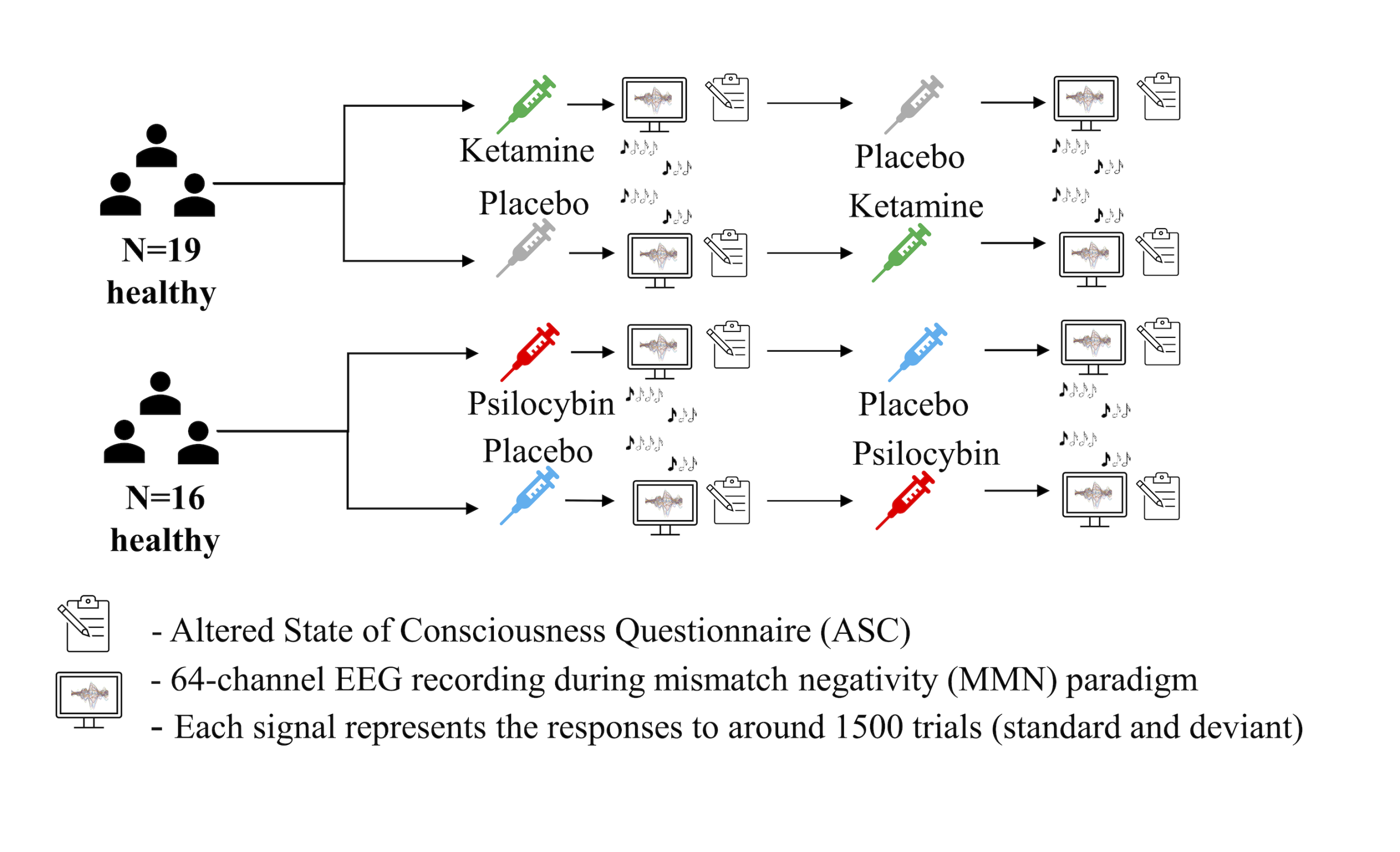 Ketamine and psilocybin have demonstrated therapeutic potential for mental disorders, including major depressive disorder, yet they engage distinct mechanisms of action. Ketamine, a dissociative hallucinogen, acts by blocking N-methyl-D-aspartate receptors (NMDAR), whereas psilocybin primarily targets serotonin receptors. These divergent mechanisms are reflected in their electrophysiological biomarkers. Objectives: This study aimed to investigate the divergent effects of ketamine and psilocybin on different elements of the EEG frequency spectrum, focusing on aperiodic components as an indicator of excitation-inhibition balance in the neural circuitry. Methods: We re-analyzed a previously acquired EEG dataset from healthy volunteers using a placebo-controlled within-subject crossover design (Schmidt et al., Neuropsychopharmacology 37(4):865–875 2012). Participants received either placebo or S-ketamine (N=19) and placebo or psilocybin (N=16) during an auditory roving paradigm. Spectral parameters including periodic and aperiodic were extracted and partial least squares analysis was employed. Results: Ketamine significantly altered the offset and slope of the EEG spectrum, suggesting a disruption in excitatory-inhibitory balance. While both drugs commonly reduced alpha power in similar regions, beta band activity was decreased exclusively under ketamine. Conclusions: These findings highlight ketamine’s unique effects on aperiodic EEG components, reinforcing its role as a neurochemical model of prodromal psychosis. Psilocybin’s effects appear distinct, emphasizing its targeted influence on oscillatory activity.
